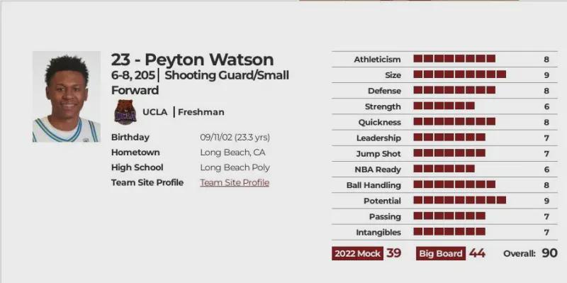优点:备受瞩目的新秀,潜力巨大,但技术非常粗糙,展现出一些中距离创造投篮进攻潜力,高中毕业时是全美排名前15的顶尖球员,拥有NBA级的运动能力和身体天赋,他是一位聪明的球员,完全融入了米克-克罗宁教练(UCLA大学)的防守体系,值得称赞的是,即使上场时间不多也没有灰心丧气,他的身高臂展、运动能力、求胜精神打下坚实的防守基础,有潜力成长为一名攻防兼备球员,体型能够胜任NBA的两个锋线位置,当然需要增强力量才能更好的应对低位防守,控球能力出色是最突出的优点之一,能够在单打中创造得分机会,投篮手感柔和、姿势标准,所以尽管投篮效率不高但因具备潜力依然备受期待,凭借臂展优势有能力在防守端制造干扰并成为一名出色的盖帽手,篮板能力也十分出色.